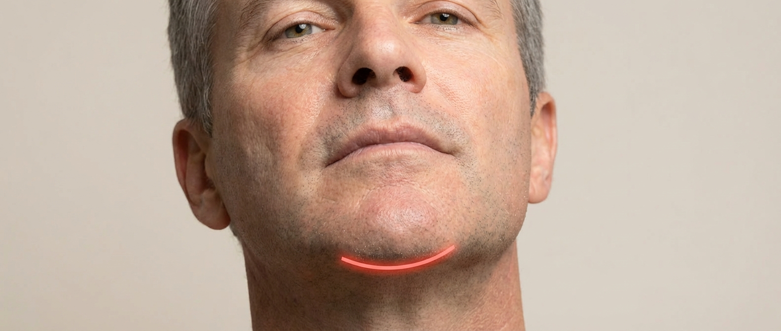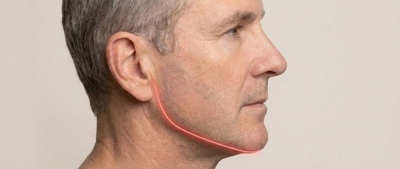 This is the “corner” of your jaw below the ear. By adding structural filler here, we create a sharp, masculine frame that provides a clear, defined separation between your face and your neck.